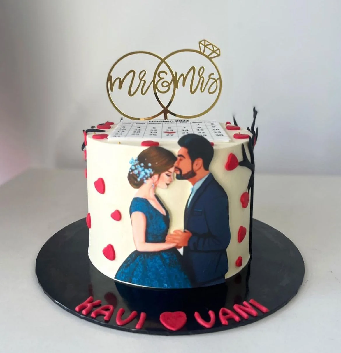 हां, आप customized name cake design बनवा सकते हैं जिसमें आपका नाम, या “Mr. & Mrs.” के साथ wedding date भी लिखी जा सकती है।